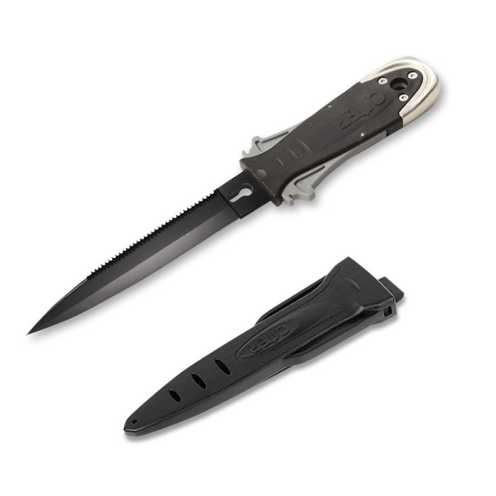Cuchillo pesca submarina - Hoja de acero inoxidable de 13,5 cm - Recubrimiento de teflón negro - Peso de acero inoxidable en el mango - Estuche y correas incluidas.