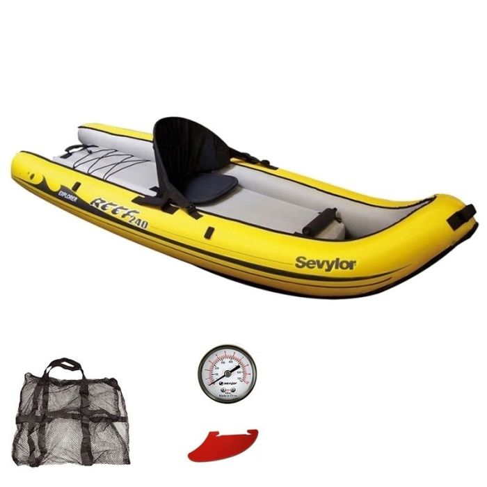 El Reef 240 SEVYLOR es un kayak hinchable sit-on-top perfecto para disfrutar del mar y del sol. Explora los fondos marinos gracias a su ventana transparente. Tiene puntos de amarre para asegurar tus accesorios de buceo.