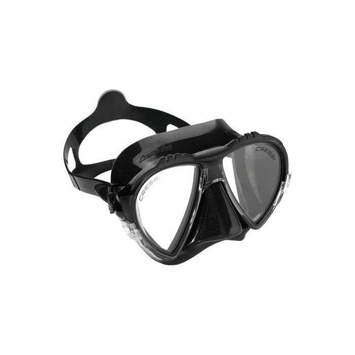 El volumen interior de la máscara es excepcionalmente reducido, inferior al de muchos de los modelos de apnea e incluso su peso es decididamente inferior. Dos hebillas a presión, integradas en la montura, hacen que sea fácil y preciso regular la correa. Esta última, de nuevo diseño, tiene una gran zona de apoyo sobre la nuca lo que genera un alto confort.