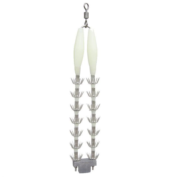 El Kraken X-2 está diseñado para profundidades medias y es adecuado para calamares de tamaño medio, aunque también puede utilizarse con ejemplares grandes y pequeños. Cuenta con 14 ganchos del mejor acero del mercado que también lo hacen muy efectivo. También tiene una alta luminiscencia que hace que el calamar en sus brazos sin pensar en la parte superior de la olla, quedando atrapado en la parte inferior, de donde es casi imposible escapar.
